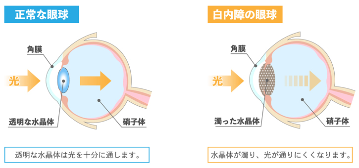 白内障は、⽬の中の「⽔晶体」が濁ることで視界がかすんだり、まぶしく感じたりする病気です。